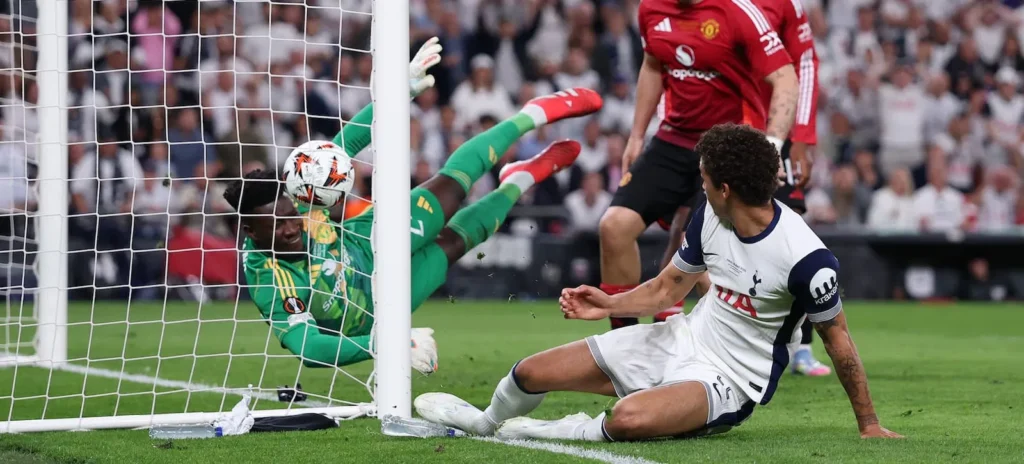 Leny Roro almost brought the game to parity after connecting with Bruno Fernandes’ free kick, but Tottenham goalkeeper Guglielmo Vicario was up to the task with a save.